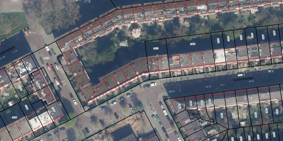 Het perceel waarop Nolensstraat 43-B staat heeft een oppervlakte van 6054 m². Dit is een zeer groot perceel. De perceeloppervlakte wordt geregistreerd door het Kadaster. Gedetailleerde informatie over de maten van dit perceel kunt u vinden in het rapport Kadastrale kaart met maatvoering van Nolensstraat 43-B.