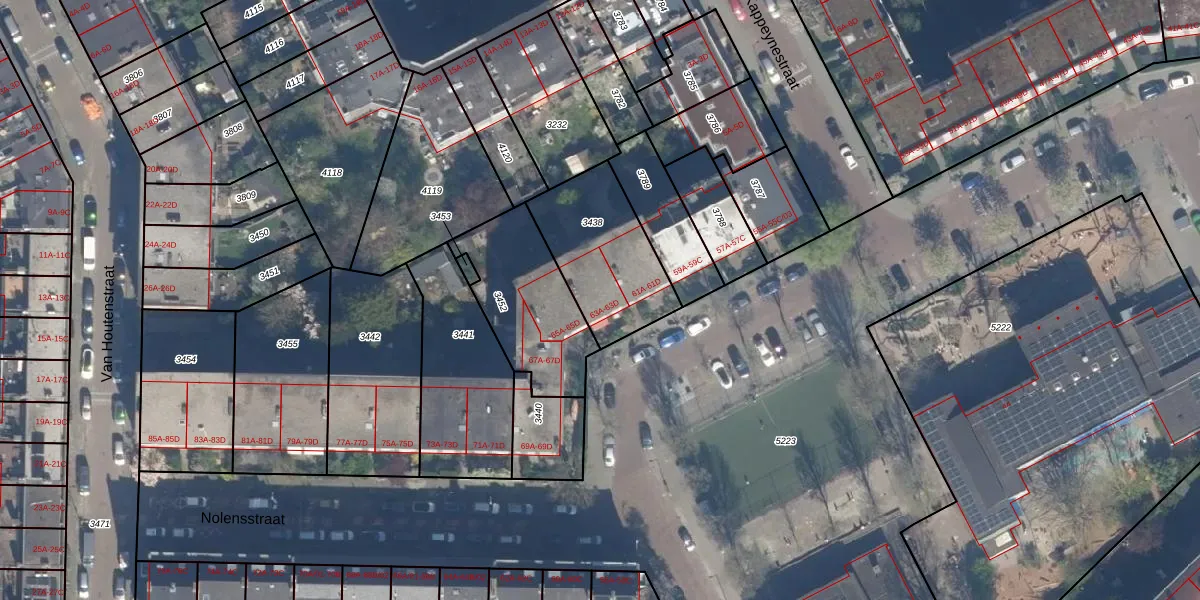Het perceel waarop Nolensstraat 63-A staat heeft een oppervlakte van 425 m². Dit is een groot perceel. De perceeloppervlakte wordt geregistreerd door het Kadaster. Gedetailleerde informatie over de maten van dit perceel kunt u vinden in het rapport Kadastrale kaart met maatvoering van Nolensstraat 63-A.