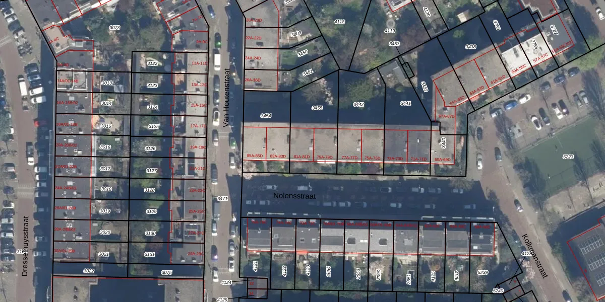 Het perceel waarop Nolensstraat 81-D staat heeft een oppervlakte van 474 m². Dit is een groot perceel. De perceeloppervlakte wordt geregistreerd door het Kadaster. Gedetailleerde informatie over de maten van dit perceel kunt u vinden in het rapport Kadastrale kaart met maatvoering van Nolensstraat 81-D.