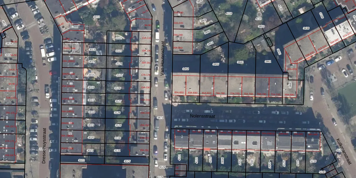 Het perceel waarop Nolensstraat 85-A staat heeft een oppervlakte van 418 m². Dit is een groot perceel. De perceeloppervlakte wordt geregistreerd door het Kadaster. Gedetailleerde informatie over de maten van dit perceel kunt u vinden in het rapport Kadastrale kaart met maatvoering van Nolensstraat 85-A.