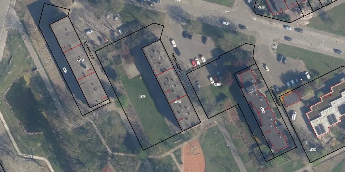 Het perceel waarop Notenoord 45 staat heeft een oppervlakte van 647 m². Dit is een groot perceel. De perceeloppervlakte wordt geregistreerd door het Kadaster. Gedetailleerde informatie over de maten van dit perceel kunt u vinden in het rapport Kadastrale kaart met maatvoering van Notenoord 45.