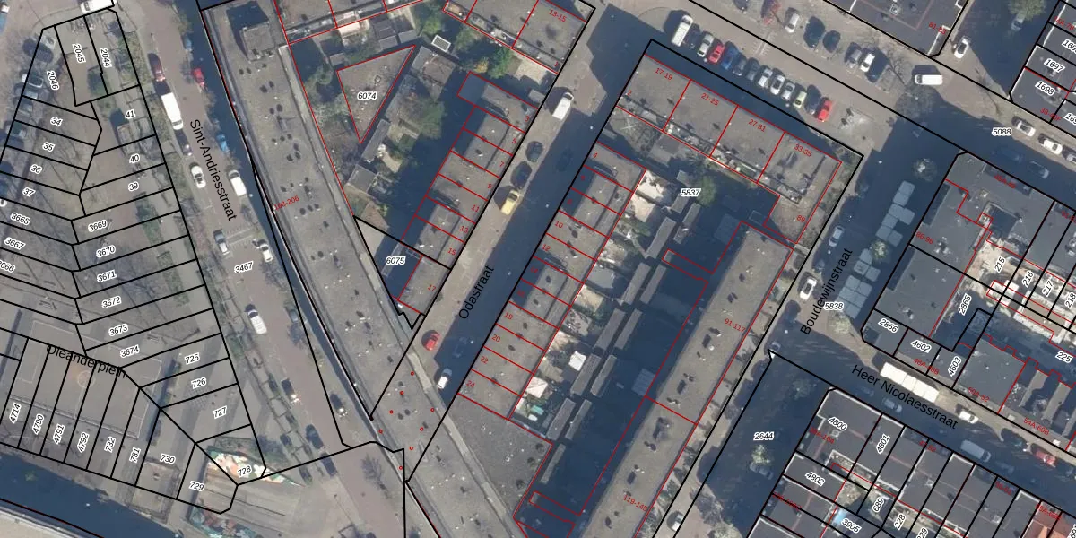 Odastraat 14 is gelegen op kadastraal perceel CLS00G5837. Deze kadastrale aanduiding is uniek en wordt gebruikt door het Kadaster om eigendomsrechten en andere zakelijke rechten vast te leggen. Het perceel maakt onderdeel uit van de kadastrale gemeente Charlois.