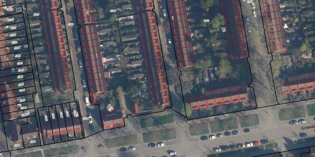 Het perceel waarop Olmendaal 155 staat heeft een oppervlakte van 6990 m². Dit is een zeer groot perceel. De perceeloppervlakte wordt geregistreerd door het Kadaster. Gedetailleerde informatie over de maten van dit perceel kunt u vinden in het rapport Kadastrale kaart met maatvoering van Olmendaal 155.