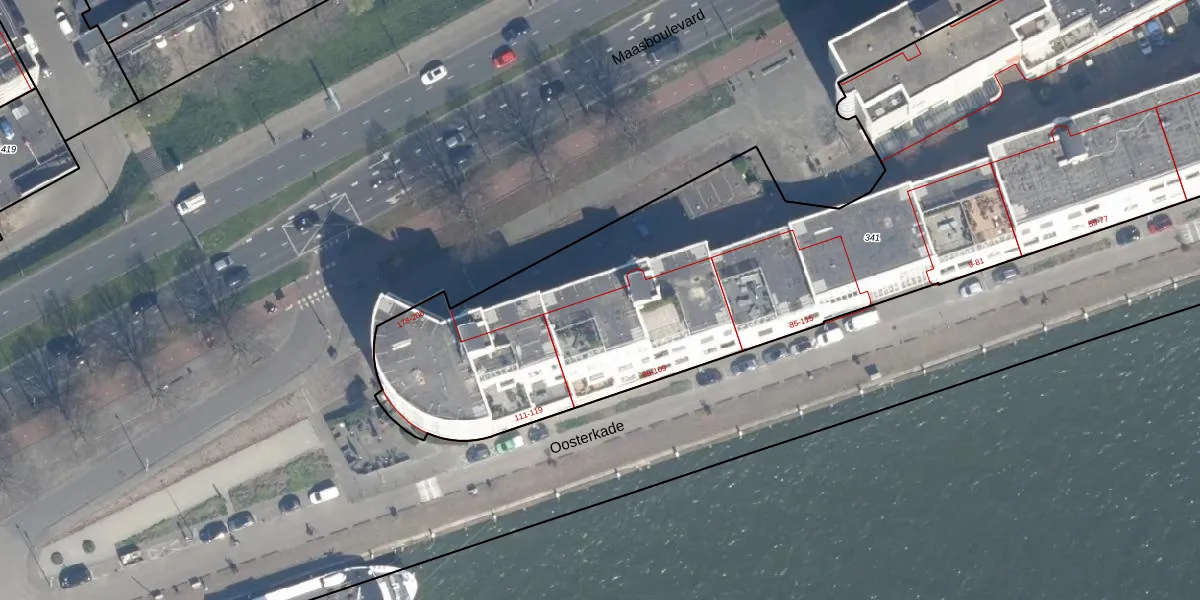 Oosterkade 107 is gelegen op kadastraal perceel RTD04AH341. Deze kadastrale aanduiding is uniek en wordt gebruikt door het Kadaster om eigendomsrechten en andere zakelijke rechten vast te leggen. Het perceel maakt onderdeel uit van de kadastrale gemeente Rotterdam.