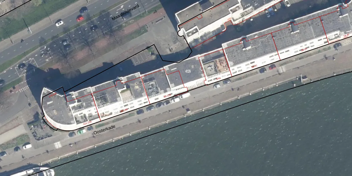 Oosterkade 115 is gelegen op kadastraal perceel RTD04AH341. Deze kadastrale aanduiding is uniek en wordt gebruikt door het Kadaster om eigendomsrechten en andere zakelijke rechten vast te leggen. Het perceel maakt onderdeel uit van de kadastrale gemeente Rotterdam.