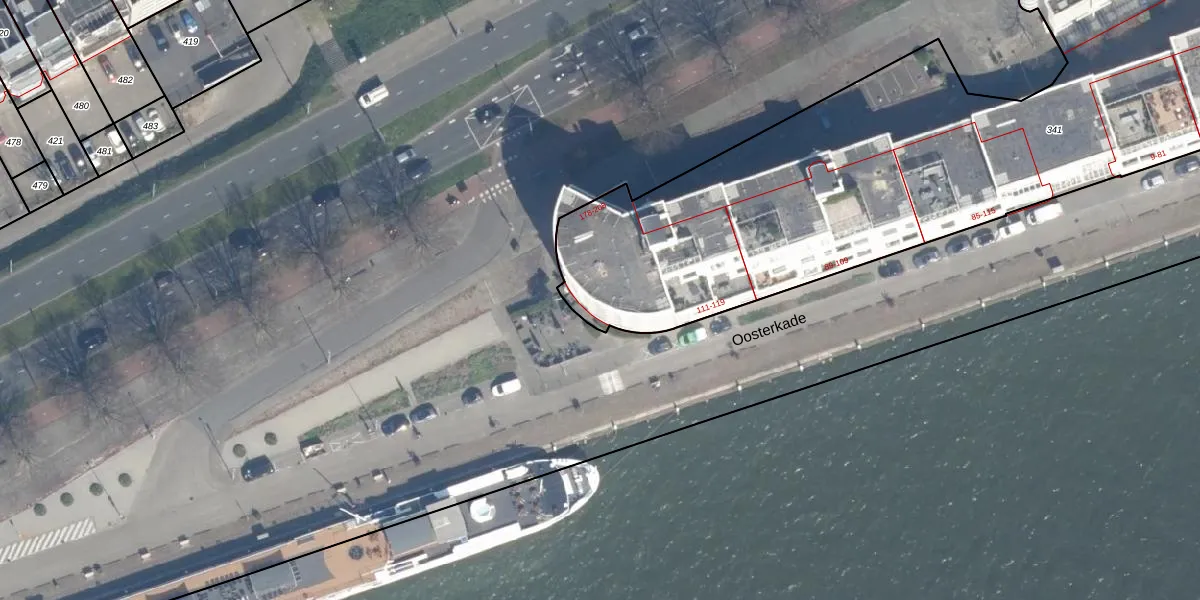 Oosterkade 119 is gelegen op kadastraal perceel RTD04AH341. Deze kadastrale aanduiding is uniek en wordt gebruikt door het Kadaster om eigendomsrechten en andere zakelijke rechten vast te leggen. Het perceel maakt onderdeel uit van de kadastrale gemeente Rotterdam.