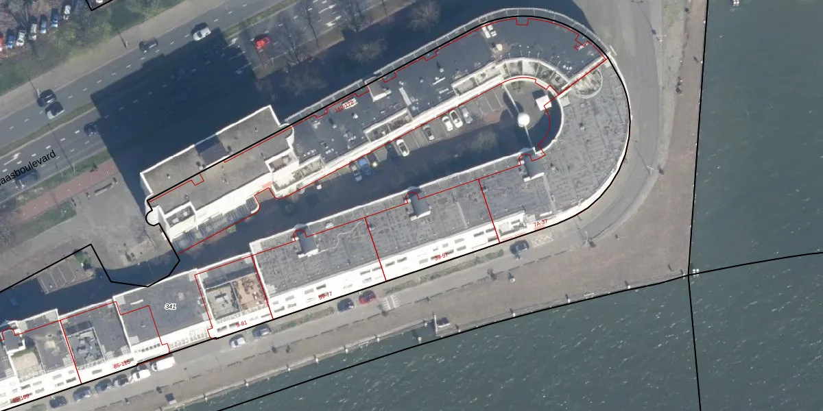 Oosterkade 45 is gelegen op kadastraal perceel RTD04AH341. Deze kadastrale aanduiding is uniek en wordt gebruikt door het Kadaster om eigendomsrechten en andere zakelijke rechten vast te leggen. Het perceel maakt onderdeel uit van de kadastrale gemeente Rotterdam.
