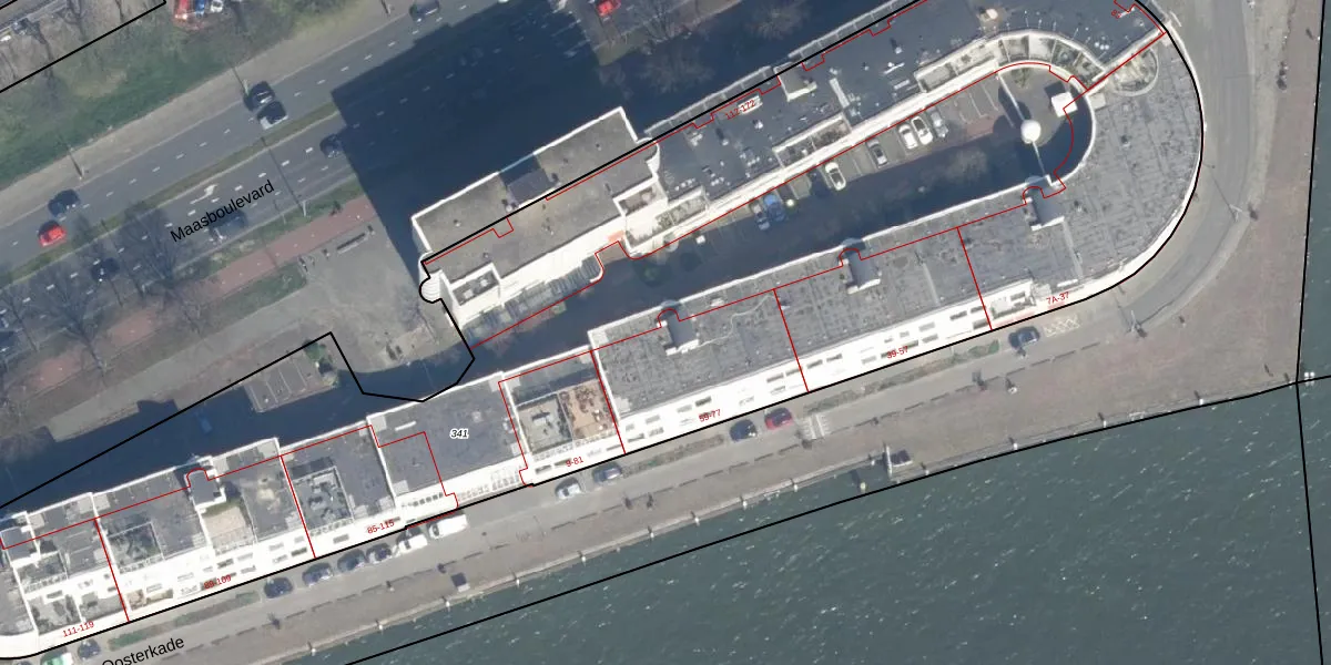 Oosterkade 75 is gelegen op kadastraal perceel RTD04AH341. Deze kadastrale aanduiding is uniek en wordt gebruikt door het Kadaster om eigendomsrechten en andere zakelijke rechten vast te leggen. Het perceel maakt onderdeel uit van de kadastrale gemeente Rotterdam.