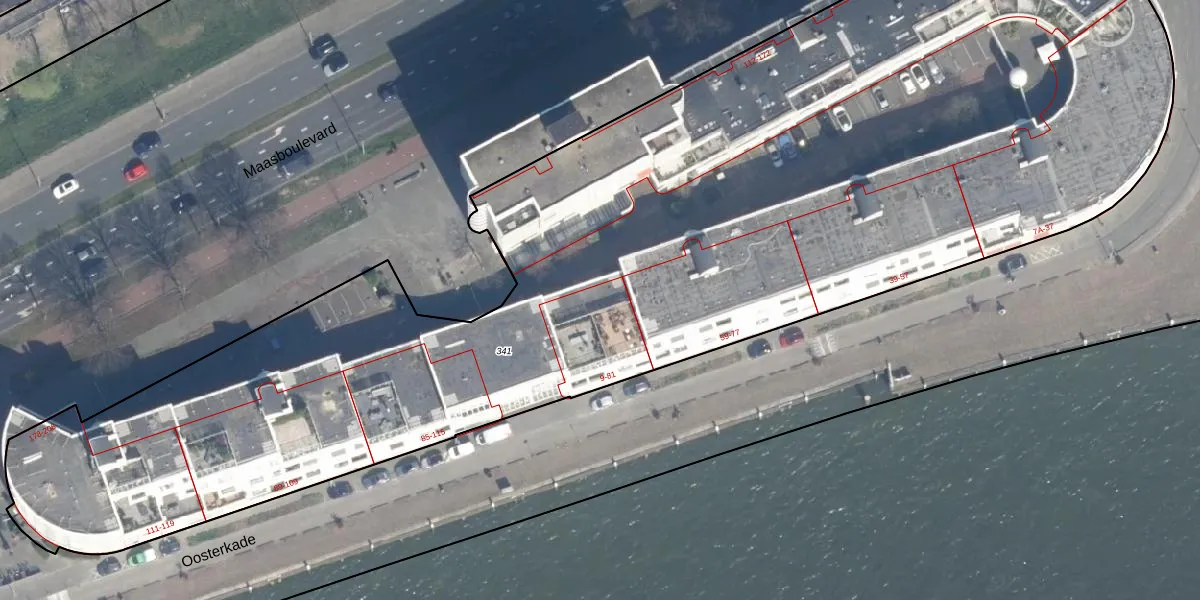 Oosterkade 79 is gelegen op kadastraal perceel RTD04AH341. Deze kadastrale aanduiding is uniek en wordt gebruikt door het Kadaster om eigendomsrechten en andere zakelijke rechten vast te leggen. Het perceel maakt onderdeel uit van de kadastrale gemeente Rotterdam.