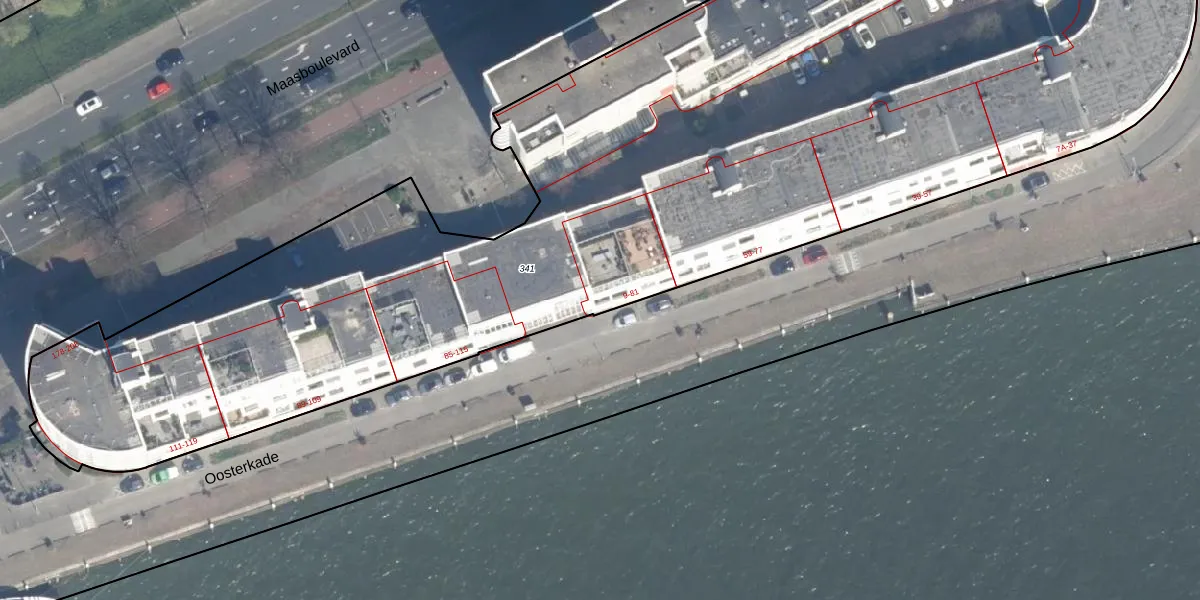 Oosterkade 9 is gelegen op kadastraal perceel RTD04AH341. Deze kadastrale aanduiding is uniek en wordt gebruikt door het Kadaster om eigendomsrechten en andere zakelijke rechten vast te leggen. Het perceel maakt onderdeel uit van de kadastrale gemeente Rotterdam.