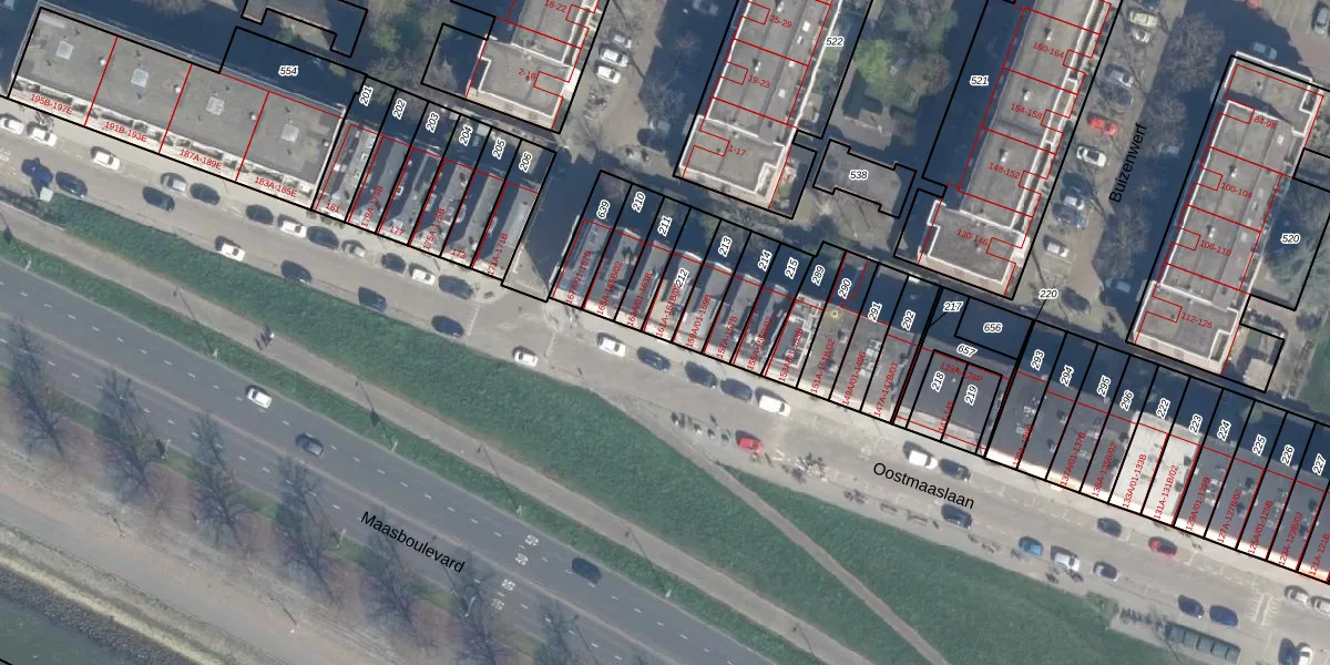 Het perceel waarop Oostmaaslaan 161-A staat heeft een oppervlakte van 96 m². Dit is een klein perceel. De perceeloppervlakte wordt geregistreerd door het Kadaster. Gedetailleerde informatie over de maten van dit perceel kunt u vinden in het rapport Kadastrale kaart met maatvoering van Oostmaaslaan 161-A.