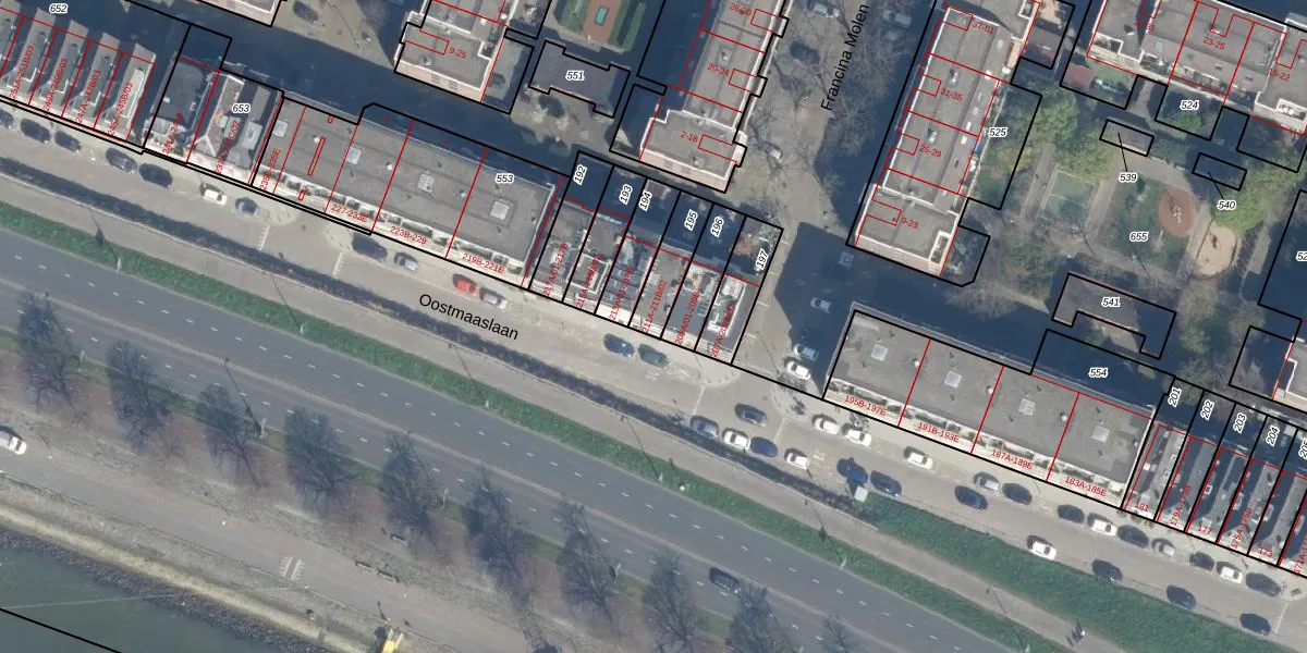 Oostmaaslaan 211-B-02 is gelegen op kadastraal perceel KLG00I195. Deze kadastrale aanduiding is uniek en wordt gebruikt door het Kadaster om eigendomsrechten en andere zakelijke rechten vast te leggen. Het perceel maakt onderdeel uit van de kadastrale gemeente Kralingen.