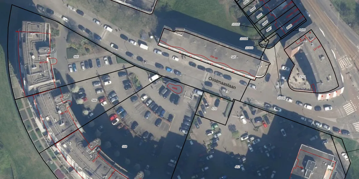 Het perceel waarop Oostmaaslaan 498-B staat heeft een oppervlakte van 4386 m². Dit is een zeer groot perceel. De perceeloppervlakte wordt geregistreerd door het Kadaster. Gedetailleerde informatie over de maten van dit perceel kunt u vinden in het rapport Kadastrale kaart met maatvoering van Oostmaaslaan 498-B.
