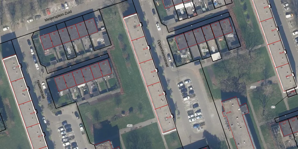Het perceel waarop Oppenheimstraat 45 staat heeft een oppervlakte van 9583 m². Dit is een zeer groot perceel. De perceeloppervlakte wordt geregistreerd door het Kadaster. Gedetailleerde informatie over de maten van dit perceel kunt u vinden in het rapport Kadastrale kaart met maatvoering van Oppenheimstraat 45.