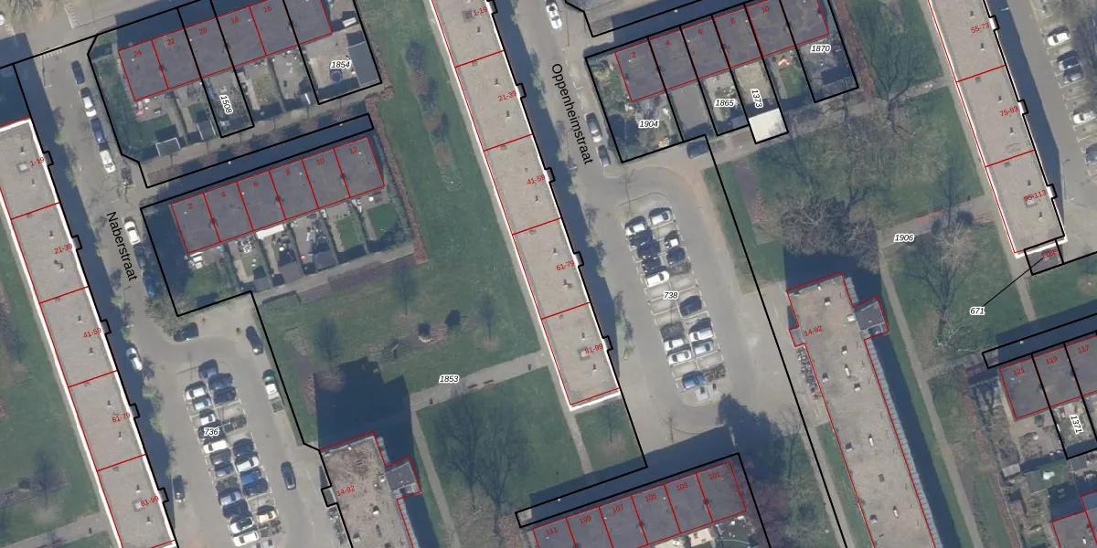 Het perceel waarop Oppenheimstraat 75 staat heeft een oppervlakte van 9583 m². Dit is een zeer groot perceel. De perceeloppervlakte wordt geregistreerd door het Kadaster. Gedetailleerde informatie over de maten van dit perceel kunt u vinden in het rapport Kadastrale kaart met maatvoering van Oppenheimstraat 75.