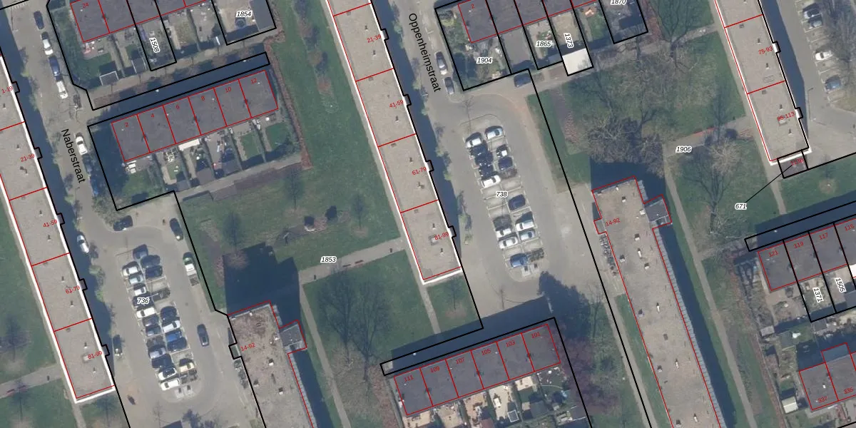 Het perceel waarop Oppenheimstraat 81 staat heeft een oppervlakte van 9583 m². Dit is een zeer groot perceel. De perceeloppervlakte wordt geregistreerd door het Kadaster. Gedetailleerde informatie over de maten van dit perceel kunt u vinden in het rapport Kadastrale kaart met maatvoering van Oppenheimstraat 81.