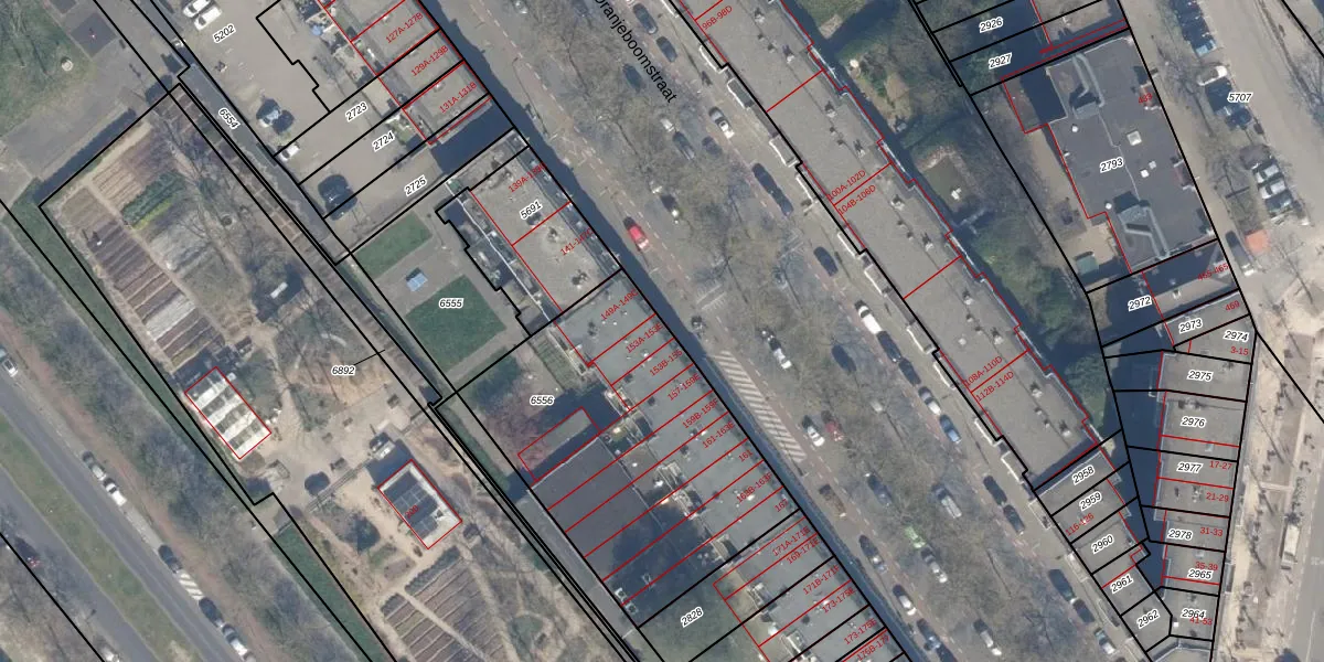 Het perceel waarop Oranjeboomstraat 153-E staat heeft een oppervlakte van 1410 m². Dit is een zeer groot perceel. De perceeloppervlakte wordt geregistreerd door het Kadaster. Gedetailleerde informatie over de maten van dit perceel kunt u vinden in het rapport Kadastrale kaart met maatvoering van Oranjeboomstraat 153-E.
