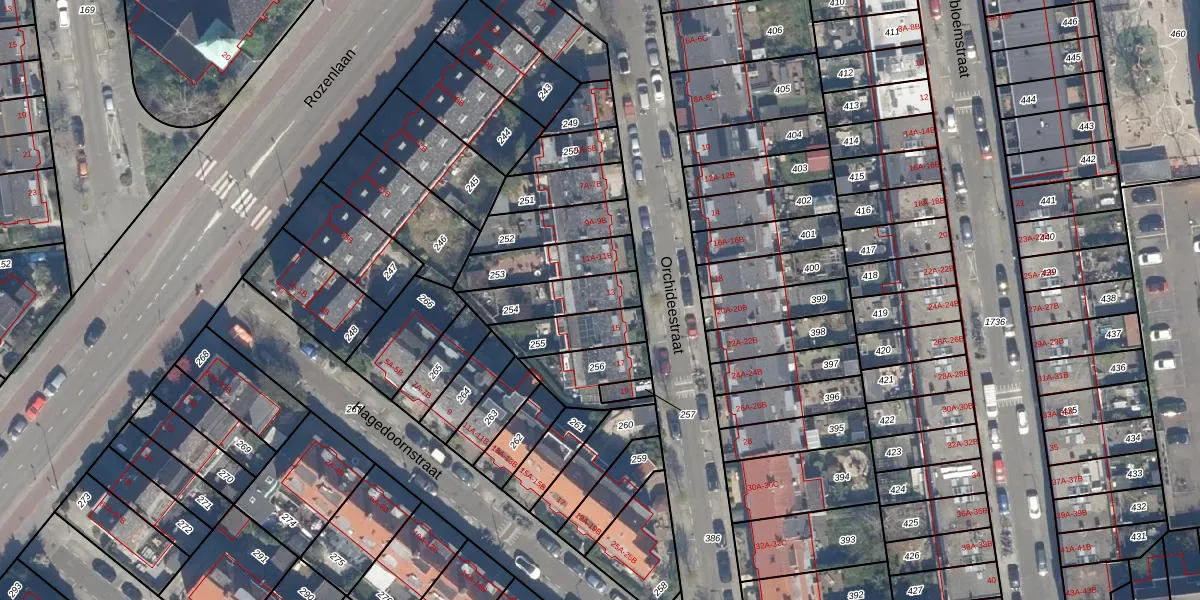 Gebruik de zoekbalk of klik op een perceel voor informatie over de adressen binnen dit perceel.