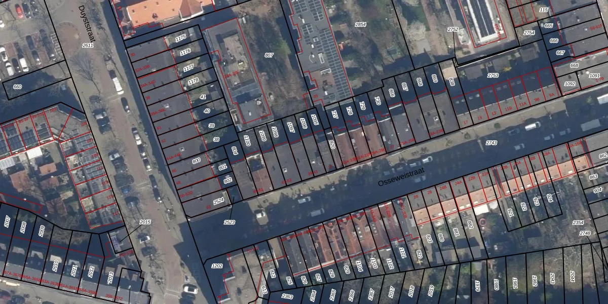 Het perceel waarop Osseweistraat 41 staat heeft een oppervlakte van 104 m². Dit is een middelgroot perceel. De perceeloppervlakte wordt geregistreerd door het Kadaster. Gedetailleerde informatie over de maten van dit perceel kunt u vinden in het rapport Kadastrale kaart met maatvoering van Osseweistraat 41.