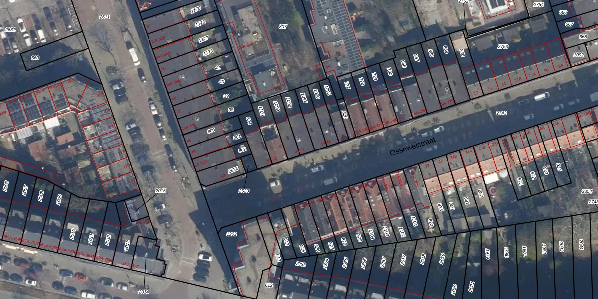 Het perceel waarop Osseweistraat 45 staat heeft een oppervlakte van 104 m². Dit is een middelgroot perceel. De perceeloppervlakte wordt geregistreerd door het Kadaster. Gedetailleerde informatie over de maten van dit perceel kunt u vinden in het rapport Kadastrale kaart met maatvoering van Osseweistraat 45.