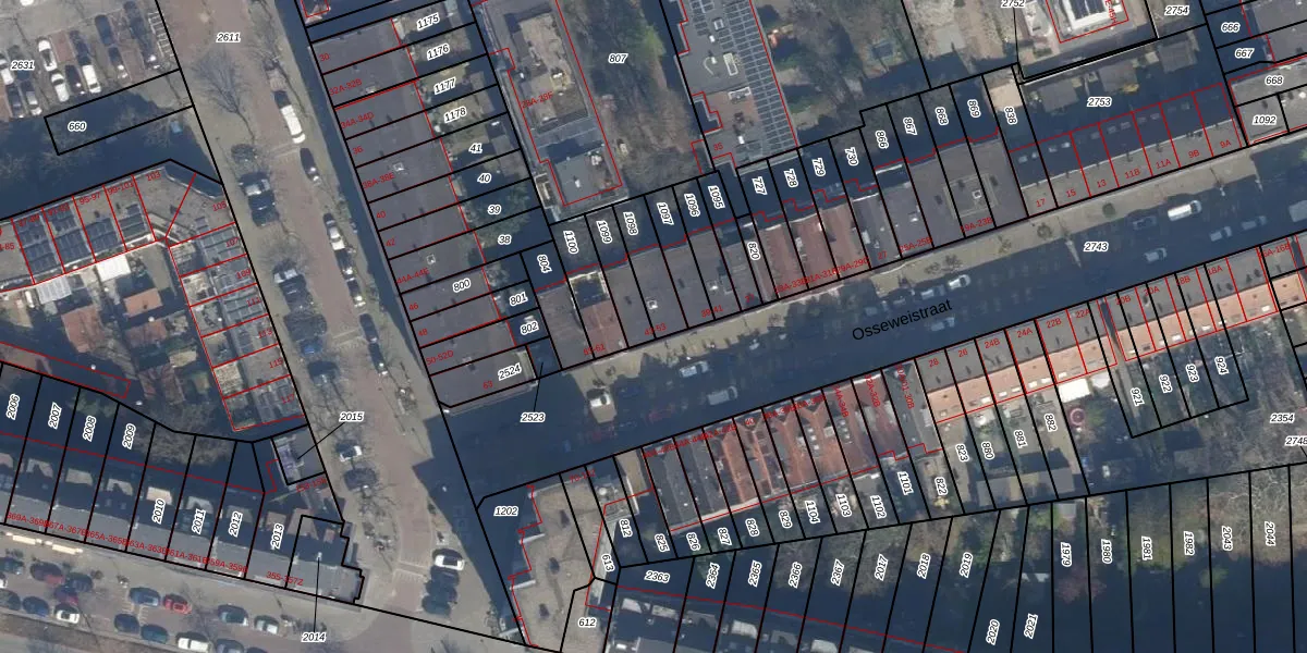 Het perceel waarop Osseweistraat 49 staat heeft een oppervlakte van 104 m². Dit is een middelgroot perceel. De perceeloppervlakte wordt geregistreerd door het Kadaster. Gedetailleerde informatie over de maten van dit perceel kunt u vinden in het rapport Kadastrale kaart met maatvoering van Osseweistraat 49.