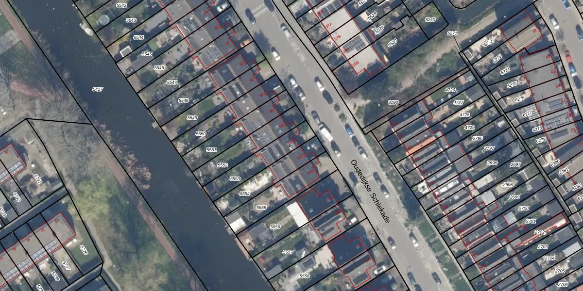 Oudedijkse Schiekade 100 is gelegen op kadastraal perceel OVS00B5553. Deze kadastrale aanduiding is uniek en wordt gebruikt door het Kadaster om eigendomsrechten en andere zakelijke rechten vast te leggen. Het perceel maakt onderdeel uit van de kadastrale gemeente Overschie.