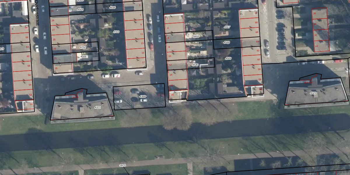 Het perceel waarop Ovidiusstraat 16 staat heeft een oppervlakte van 1504 m². Dit is een zeer groot perceel. De perceeloppervlakte wordt geregistreerd door het Kadaster. Gedetailleerde informatie over de maten van dit perceel kunt u vinden in het rapport Kadastrale kaart met maatvoering van Ovidiusstraat 16.