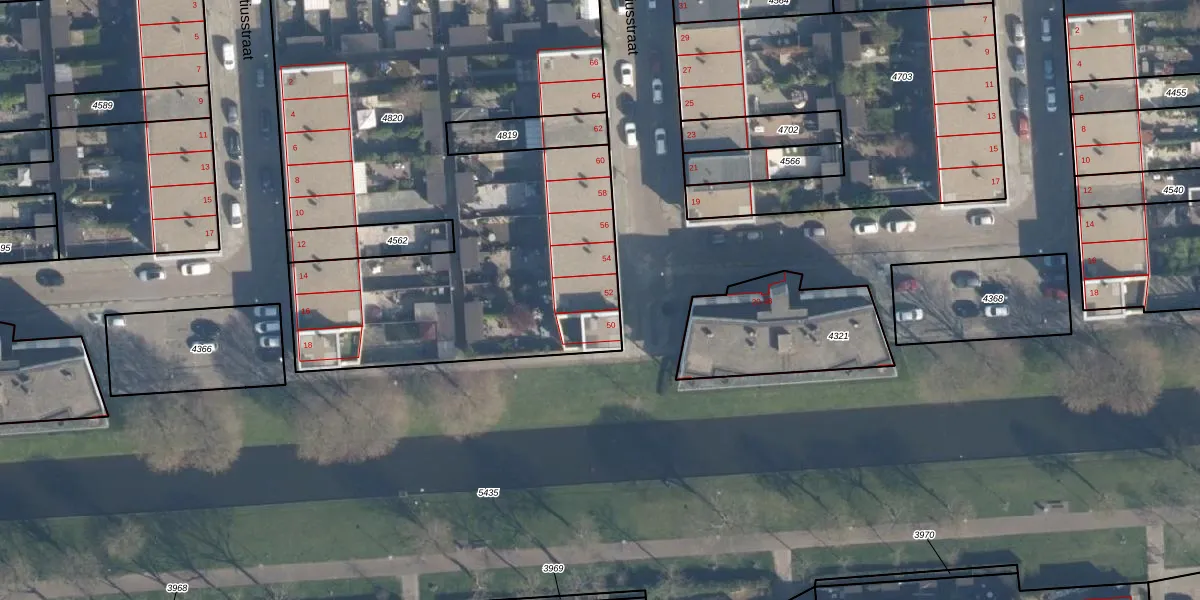 Het perceel waarop Ovidiusstraat 52 staat heeft een oppervlakte van 3860 m². Dit is een zeer groot perceel. De perceeloppervlakte wordt geregistreerd door het Kadaster. Gedetailleerde informatie over de maten van dit perceel kunt u vinden in het rapport Kadastrale kaart met maatvoering van Ovidiusstraat 52.