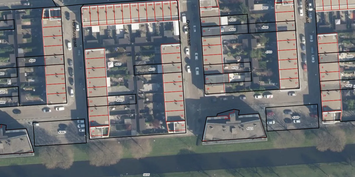 Het perceel waarop Ovidiusstraat 58 staat heeft een oppervlakte van 3860 m². Dit is een zeer groot perceel. De perceeloppervlakte wordt geregistreerd door het Kadaster. Gedetailleerde informatie over de maten van dit perceel kunt u vinden in het rapport Kadastrale kaart met maatvoering van Ovidiusstraat 58.