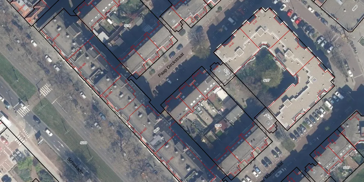 Paap Dirckstraat 58 is gelegen op kadastraal perceel RTD08X5274. Deze kadastrale aanduiding is uniek en wordt gebruikt door het Kadaster om eigendomsrechten en andere zakelijke rechten vast te leggen. Het perceel maakt onderdeel uit van de kadastrale gemeente Rotterdam.