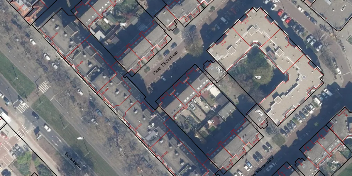 Paap Dirckstraat 60 is gelegen op kadastraal perceel RTD08X5274. Deze kadastrale aanduiding is uniek en wordt gebruikt door het Kadaster om eigendomsrechten en andere zakelijke rechten vast te leggen. Het perceel maakt onderdeel uit van de kadastrale gemeente Rotterdam.