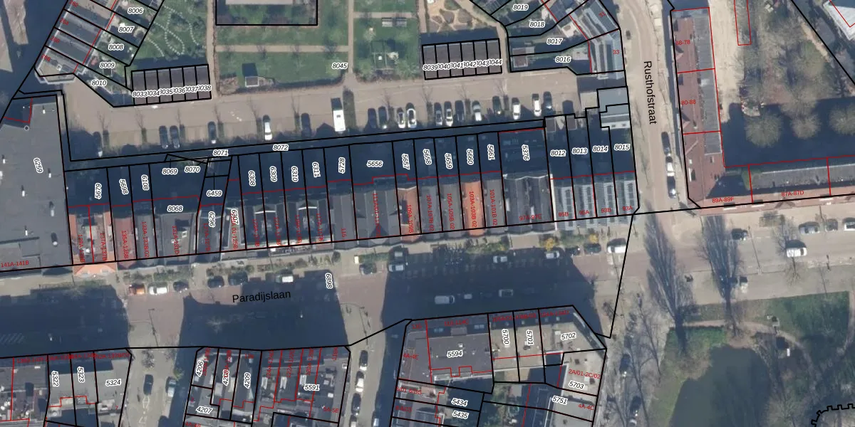 Paradijslaan 107-B-01 is gelegen op kadastraal perceel RTD07R5658. Deze kadastrale aanduiding is uniek en wordt gebruikt door het Kadaster om eigendomsrechten en andere zakelijke rechten vast te leggen. Het perceel maakt onderdeel uit van de kadastrale gemeente Rotterdam.