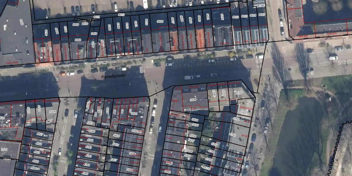 Paradijslaan 116 is gelegen op kadastraal perceel RTD07R5594. Deze kadastrale aanduiding is uniek en wordt gebruikt door het Kadaster om eigendomsrechten en andere zakelijke rechten vast te leggen. Het perceel maakt onderdeel uit van de kadastrale gemeente Rotterdam.