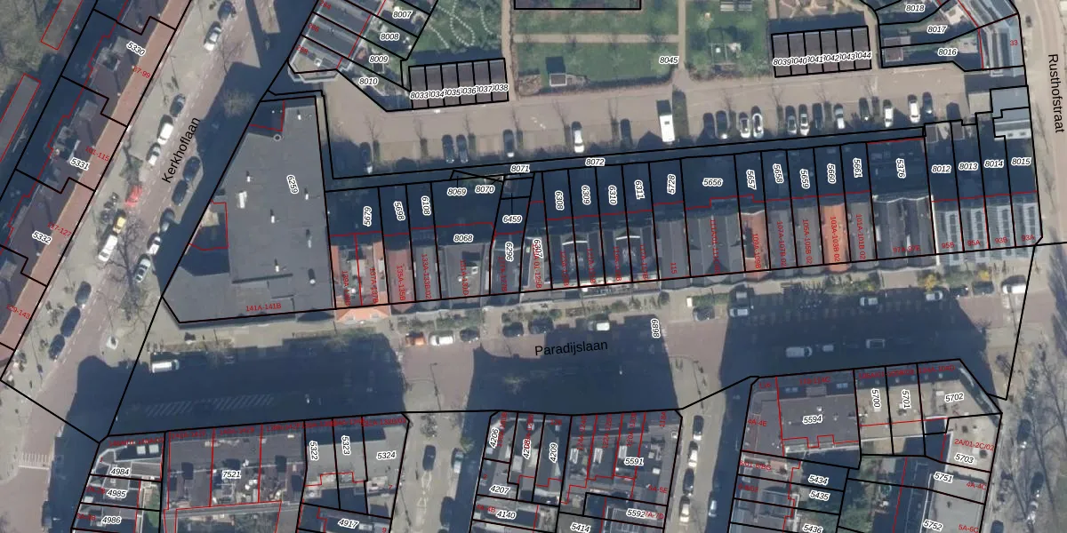 Paradijslaan 125-A-01 is gelegen op kadastraal perceel RTD07R6307. Deze kadastrale aanduiding is uniek en wordt gebruikt door het Kadaster om eigendomsrechten en andere zakelijke rechten vast te leggen. Het perceel maakt onderdeel uit van de kadastrale gemeente Rotterdam.