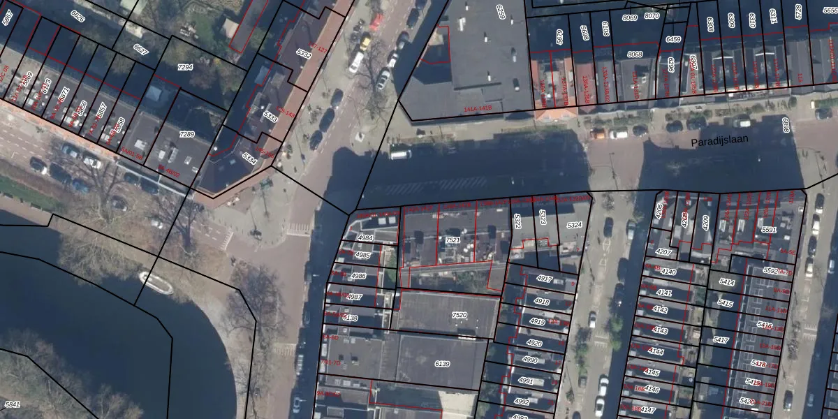Paradijslaan 142-A is gelegen op kadastraal perceel RTD07R7521. Deze kadastrale aanduiding is uniek en wordt gebruikt door het Kadaster om eigendomsrechten en andere zakelijke rechten vast te leggen. Het perceel maakt onderdeel uit van de kadastrale gemeente Rotterdam.