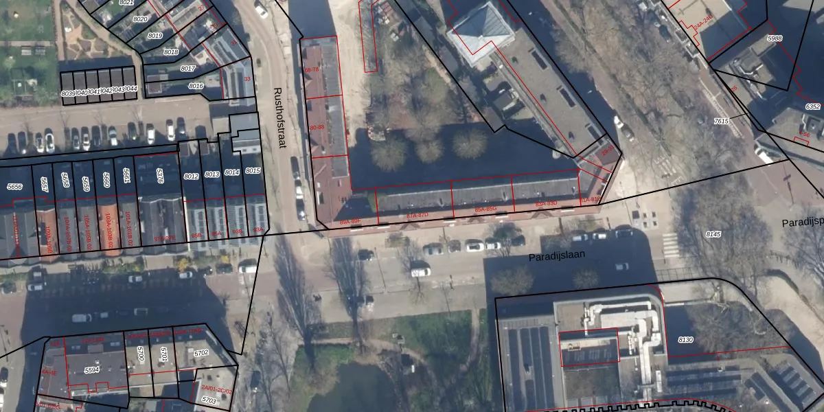 Paradijslaan 87-B is gelegen op kadastraal perceel RTD07R7472. Deze kadastrale aanduiding is uniek en wordt gebruikt door het Kadaster om eigendomsrechten en andere zakelijke rechten vast te leggen. Het perceel maakt onderdeel uit van de kadastrale gemeente Rotterdam.