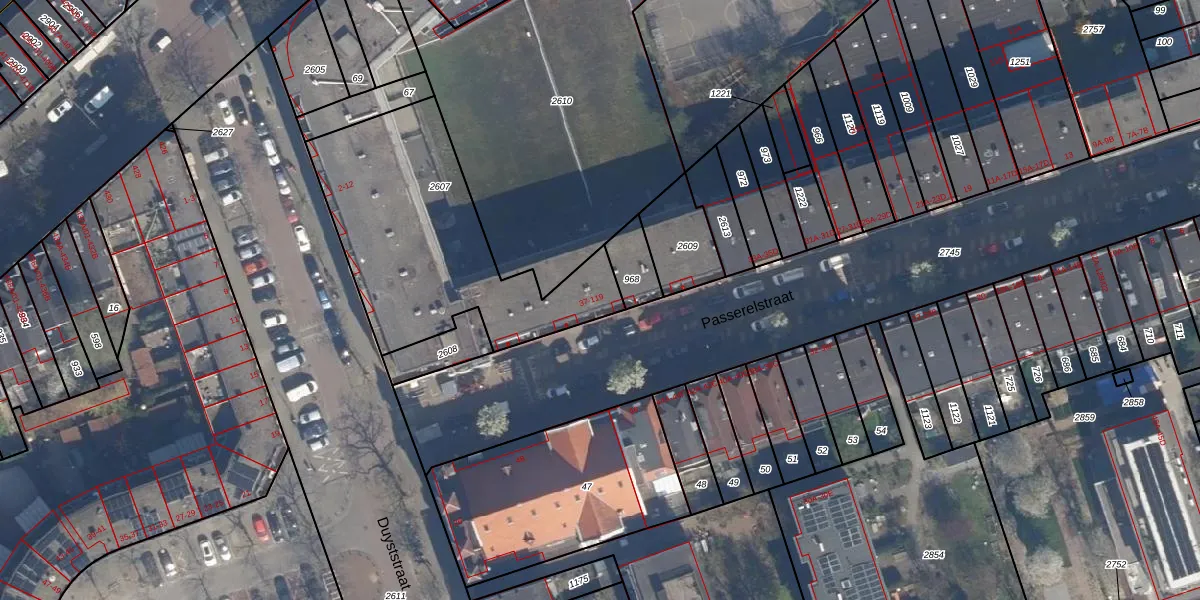 Het perceel waarop Passerelstraat 43-B staat heeft een oppervlakte van 1047 m². Dit is een zeer groot perceel. De perceeloppervlakte wordt geregistreerd door het Kadaster. Gedetailleerde informatie over de maten van dit perceel kunt u vinden in het rapport Kadastrale kaart met maatvoering van Passerelstraat 43-B.