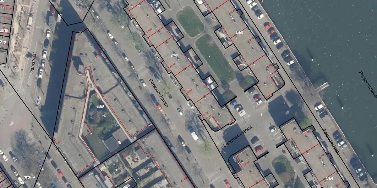 Het perceel waarop Persoonshaven 48 staat heeft een oppervlakte van 1827 m². Dit is een zeer groot perceel. De perceeloppervlakte wordt geregistreerd door het Kadaster. Gedetailleerde informatie over de maten van dit perceel kunt u vinden in het rapport Kadastrale kaart met maatvoering van Persoonshaven 48.
