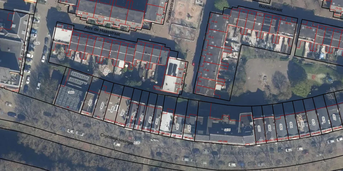Het perceel waarop Pisuissestraat 49 staat heeft een oppervlakte van 2015 m². Dit is een zeer groot perceel. De perceeloppervlakte wordt geregistreerd door het Kadaster. Gedetailleerde informatie over de maten van dit perceel kunt u vinden in het rapport Kadastrale kaart met maatvoering van Pisuissestraat 49.