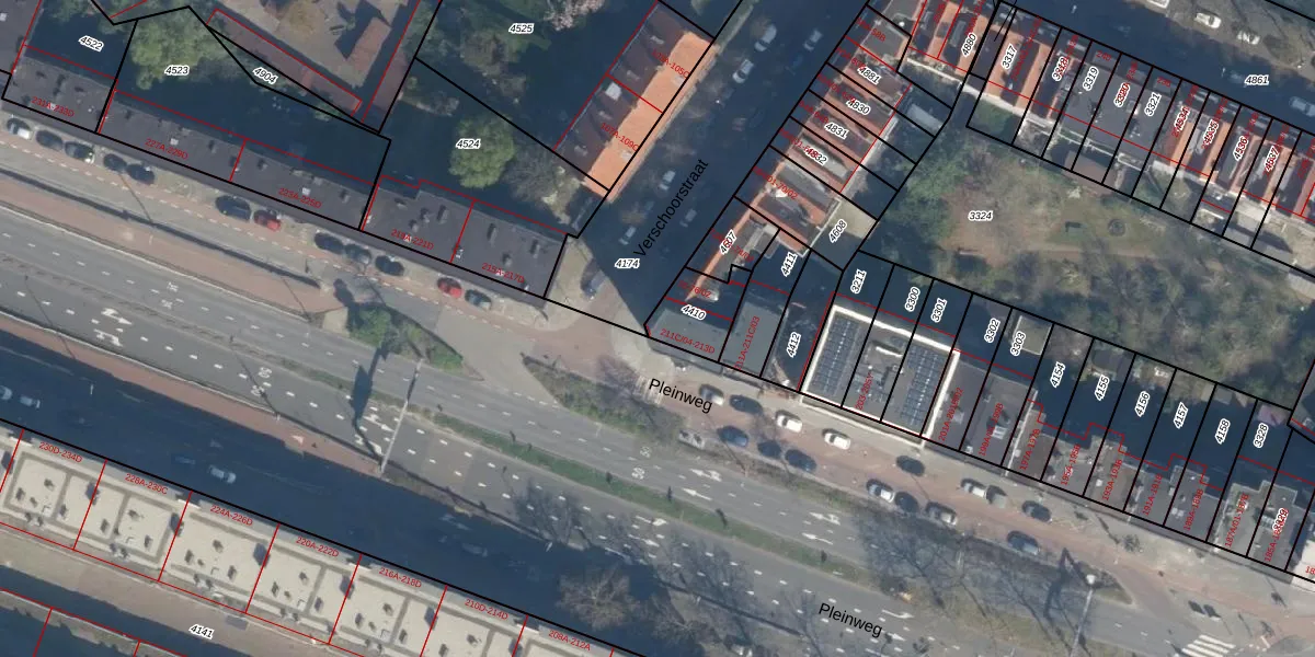 Pleinweg 213-D is gelegen op kadastraal perceel CLS00E4410. Deze kadastrale aanduiding is uniek en wordt gebruikt door het Kadaster om eigendomsrechten en andere zakelijke rechten vast te leggen. Het perceel maakt onderdeel uit van de kadastrale gemeente Charlois.