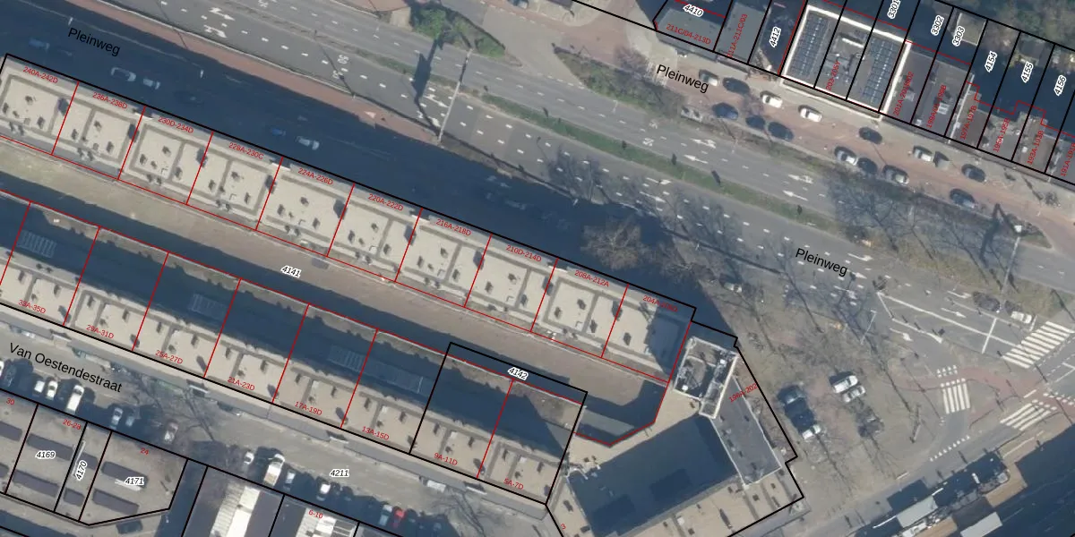 Pleinweg 214-D is gelegen op kadastraal perceel CLS00E4141. Deze kadastrale aanduiding is uniek en wordt gebruikt door het Kadaster om eigendomsrechten en andere zakelijke rechten vast te leggen. Het perceel maakt onderdeel uit van de kadastrale gemeente Charlois.