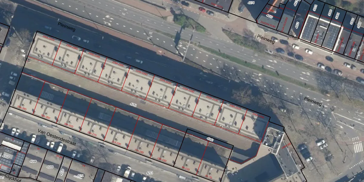 Pleinweg 216-B is gelegen op kadastraal perceel CLS00E4141. Deze kadastrale aanduiding is uniek en wordt gebruikt door het Kadaster om eigendomsrechten en andere zakelijke rechten vast te leggen. Het perceel maakt onderdeel uit van de kadastrale gemeente Charlois.