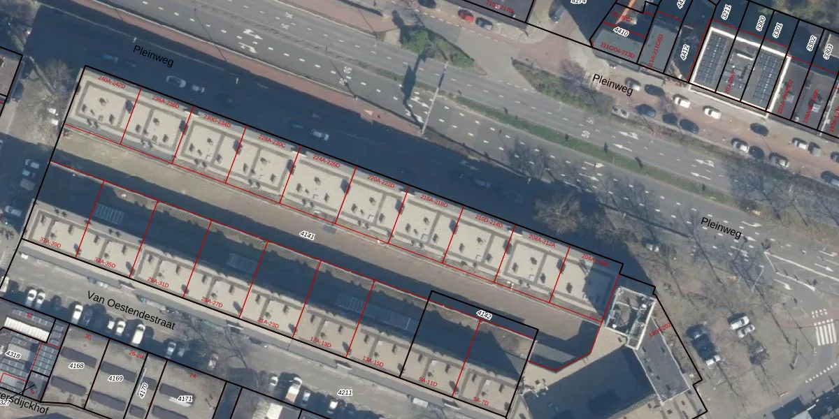 Pleinweg 218-B is gelegen op kadastraal perceel CLS00E4141. Deze kadastrale aanduiding is uniek en wordt gebruikt door het Kadaster om eigendomsrechten en andere zakelijke rechten vast te leggen. Het perceel maakt onderdeel uit van de kadastrale gemeente Charlois.