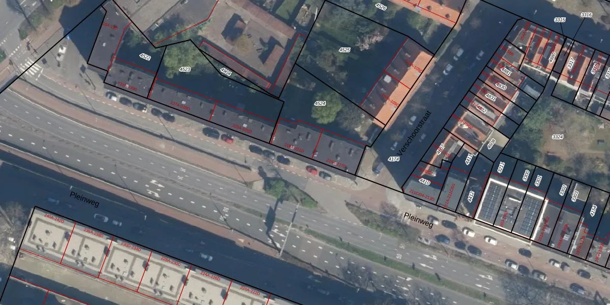 Pleinweg 219-B is gelegen op kadastraal perceel CLS00E4524. Deze kadastrale aanduiding is uniek en wordt gebruikt door het Kadaster om eigendomsrechten en andere zakelijke rechten vast te leggen. Het perceel maakt onderdeel uit van de kadastrale gemeente Charlois.