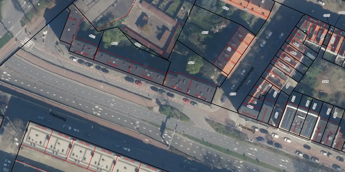Pleinweg 221-C is gelegen op kadastraal perceel CLS00E4524. Deze kadastrale aanduiding is uniek en wordt gebruikt door het Kadaster om eigendomsrechten en andere zakelijke rechten vast te leggen. Het perceel maakt onderdeel uit van de kadastrale gemeente Charlois.