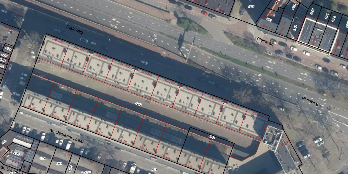 Pleinweg 222-B is gelegen op kadastraal perceel CLS00E4141. Deze kadastrale aanduiding is uniek en wordt gebruikt door het Kadaster om eigendomsrechten en andere zakelijke rechten vast te leggen. Het perceel maakt onderdeel uit van de kadastrale gemeente Charlois.