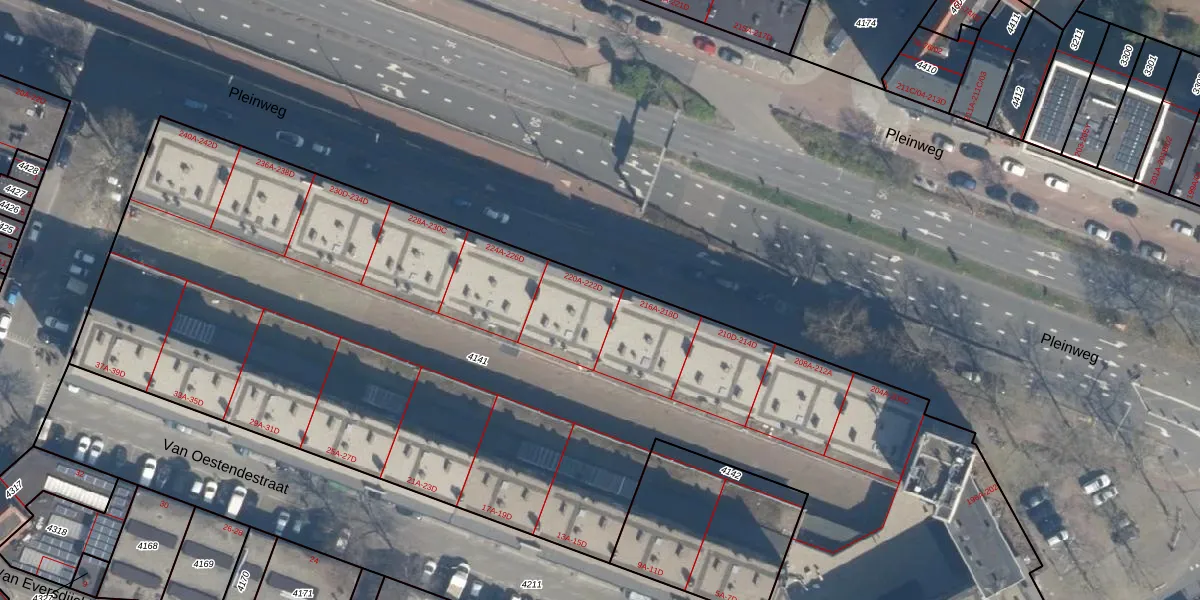 Pleinweg 222-D is gelegen op kadastraal perceel CLS00E4141. Deze kadastrale aanduiding is uniek en wordt gebruikt door het Kadaster om eigendomsrechten en andere zakelijke rechten vast te leggen. Het perceel maakt onderdeel uit van de kadastrale gemeente Charlois.