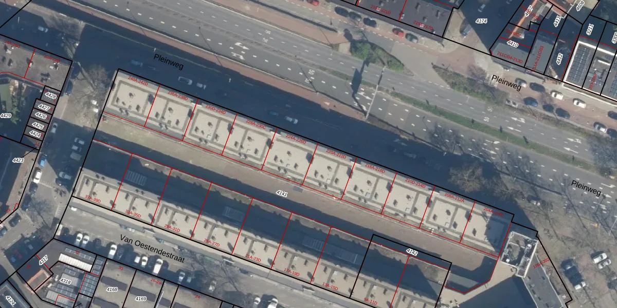 Pleinweg 224-A is gelegen op kadastraal perceel CLS00E4141. Deze kadastrale aanduiding is uniek en wordt gebruikt door het Kadaster om eigendomsrechten en andere zakelijke rechten vast te leggen. Het perceel maakt onderdeel uit van de kadastrale gemeente Charlois.
