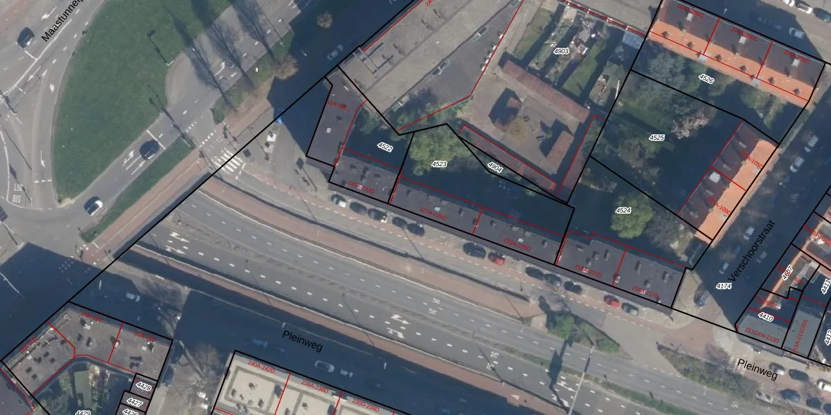 Pleinweg 229-B is gelegen op kadastraal perceel CLS00E4523. Deze kadastrale aanduiding is uniek en wordt gebruikt door het Kadaster om eigendomsrechten en andere zakelijke rechten vast te leggen. Het perceel maakt onderdeel uit van de kadastrale gemeente Charlois.