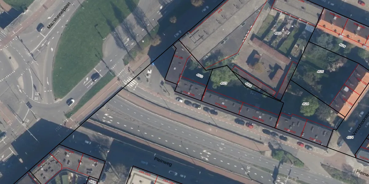 Pleinweg 233-D is gelegen op kadastraal perceel CLS00E4522. Deze kadastrale aanduiding is uniek en wordt gebruikt door het Kadaster om eigendomsrechten en andere zakelijke rechten vast te leggen. Het perceel maakt onderdeel uit van de kadastrale gemeente Charlois.